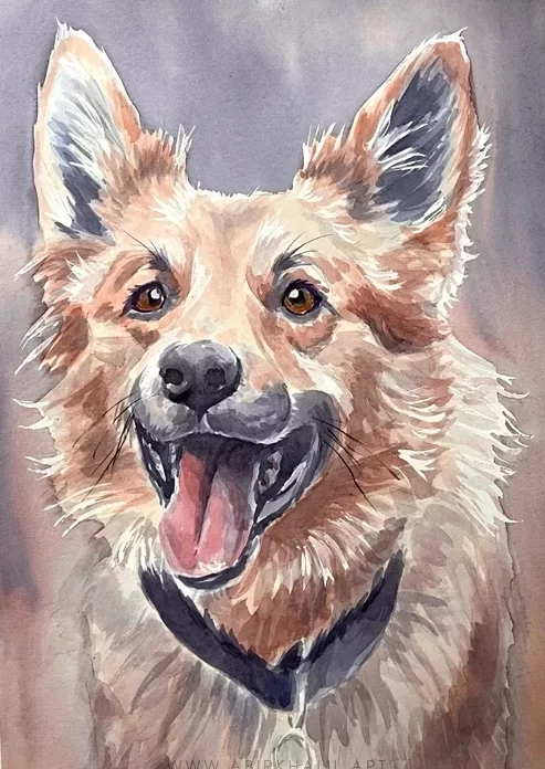 These paintings are primarily done in watercolor with a touch of gouache. They offer a stylised and uplifting portrayal of your pet, infused with bright, cheerful colors and a fun, expressive flair.